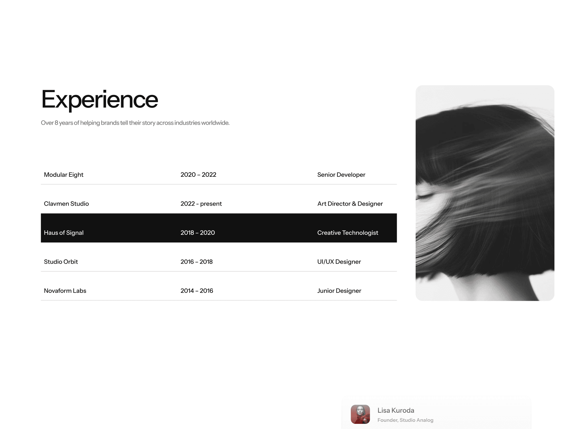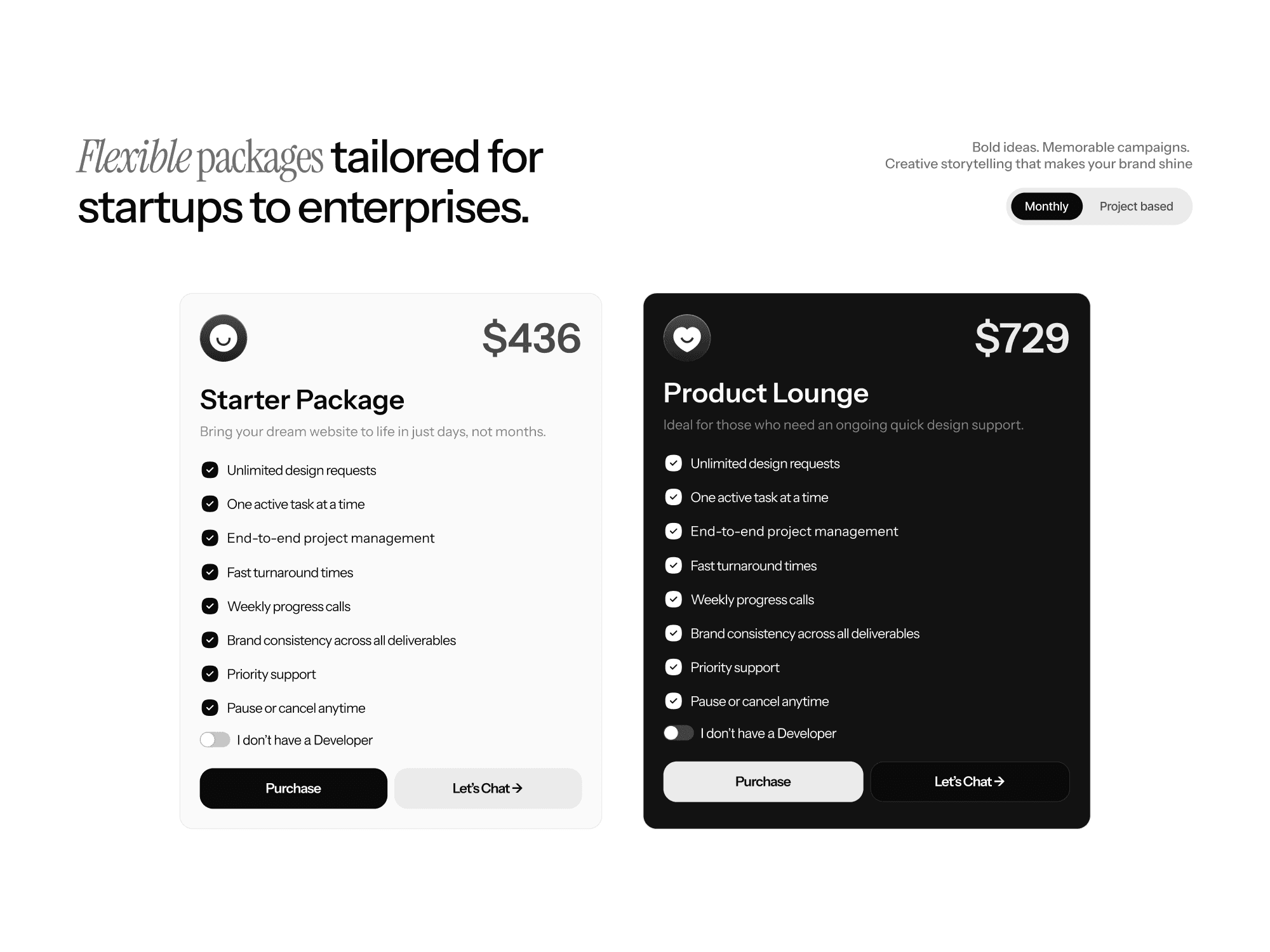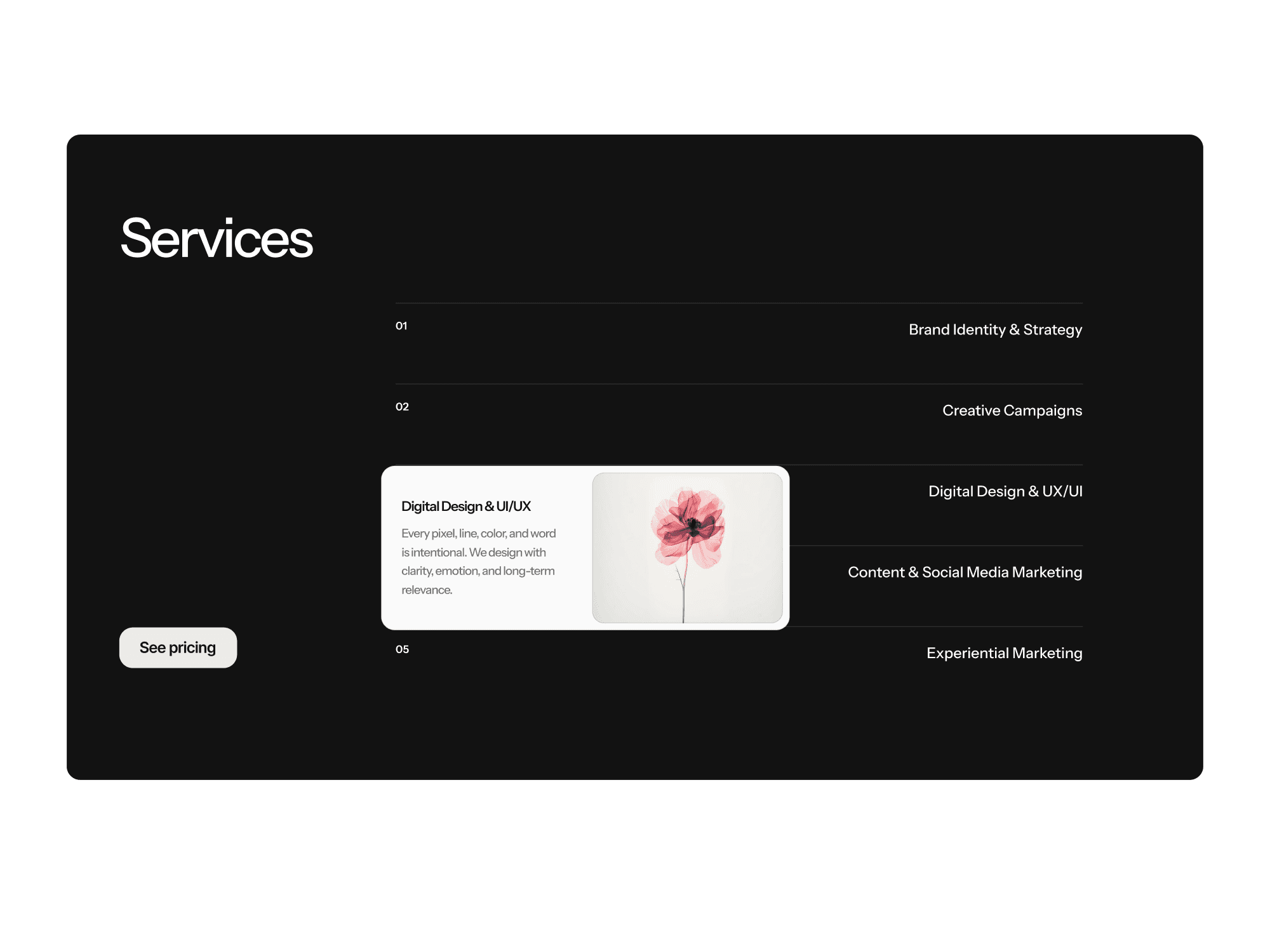 We developed a sleek, editorial-inspired website built on clean typography, monochromatic visuals, and high-impact imagery. Clear sections were created for featured work, services, pricing packages, testimonials, and studio experience—ensuring an intuitive browsing journey. Interactive elements and modern layouts highlight their portfolio in a way that feels both premium and effortless. The design language blends simplicity with artistry, perfectly matching the studio’s identity.