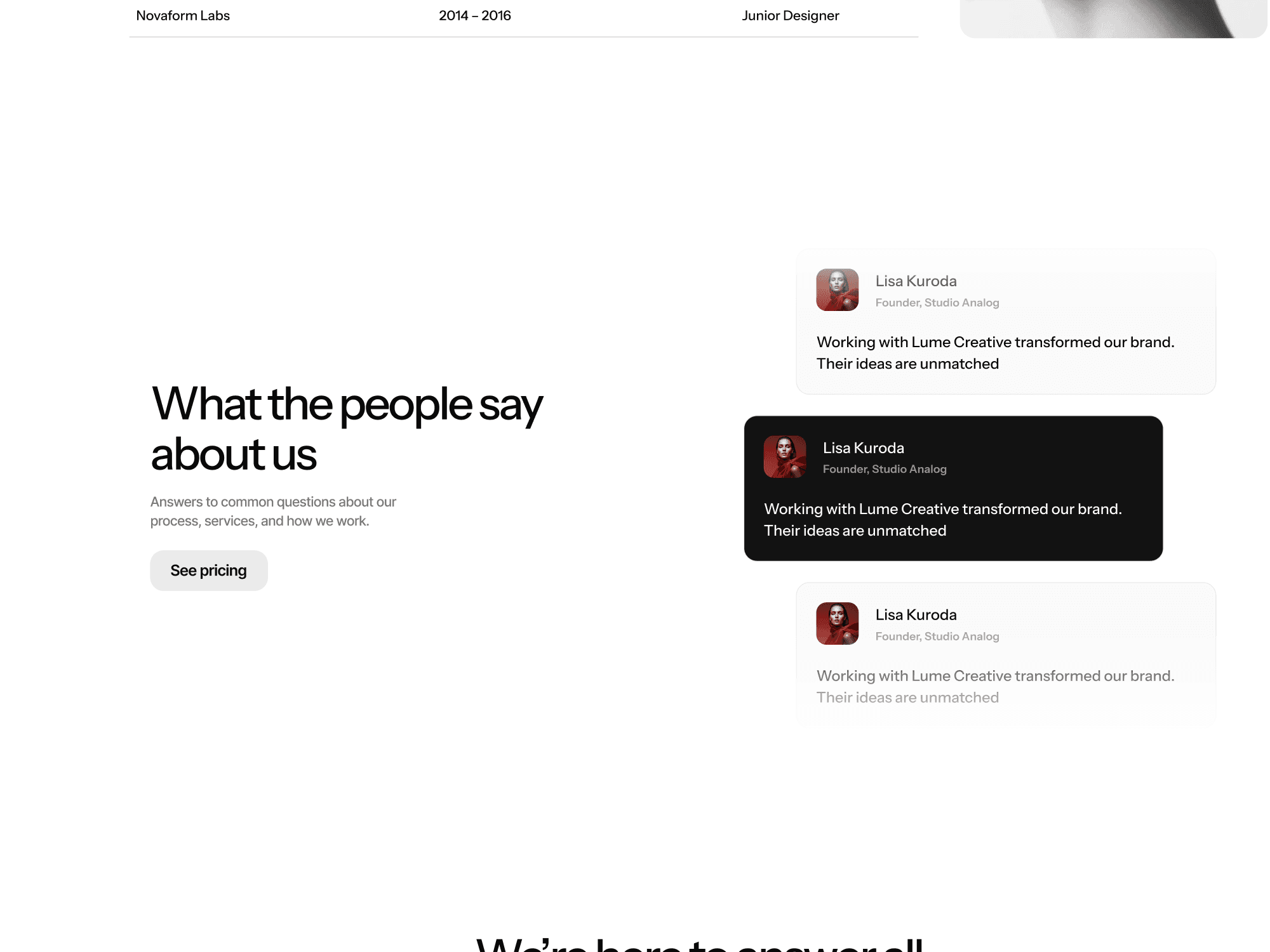 The updated Lume Creatives site significantly improved brand perception, strengthened credibility, and supported higher client inquiry rates. With a clearer structure, refined visual hierarchy, and a premium aesthetic, the new website helps the studio better market its capabilities and stand out as a top-tier creative partner.